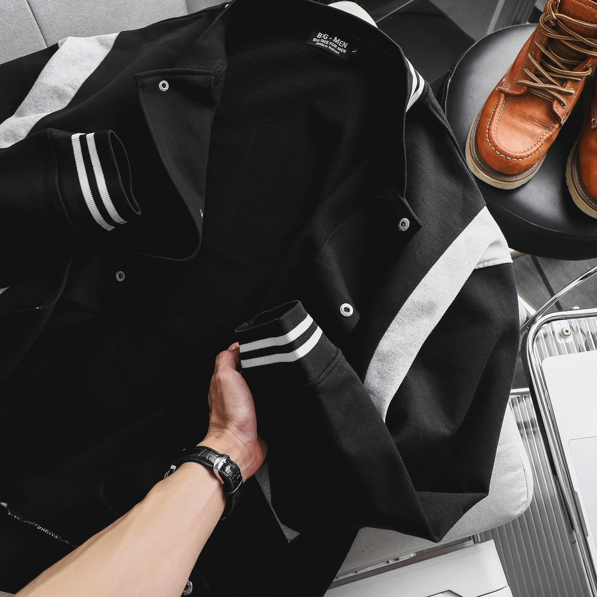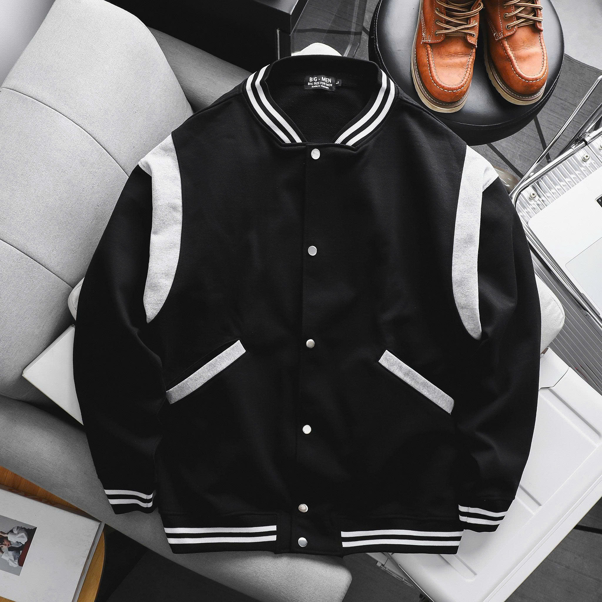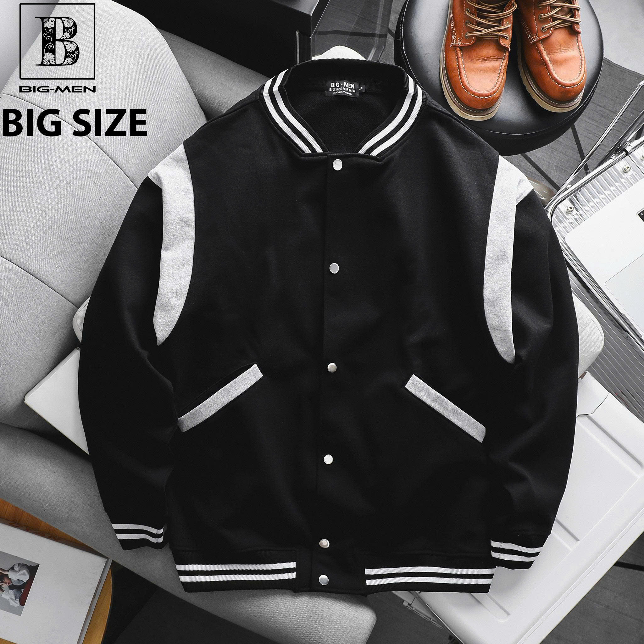 - Thiết Kế: Dáng Varsity/Bomber Jacket classic, form suông rộng rãi (Form Rộng/Oversize).