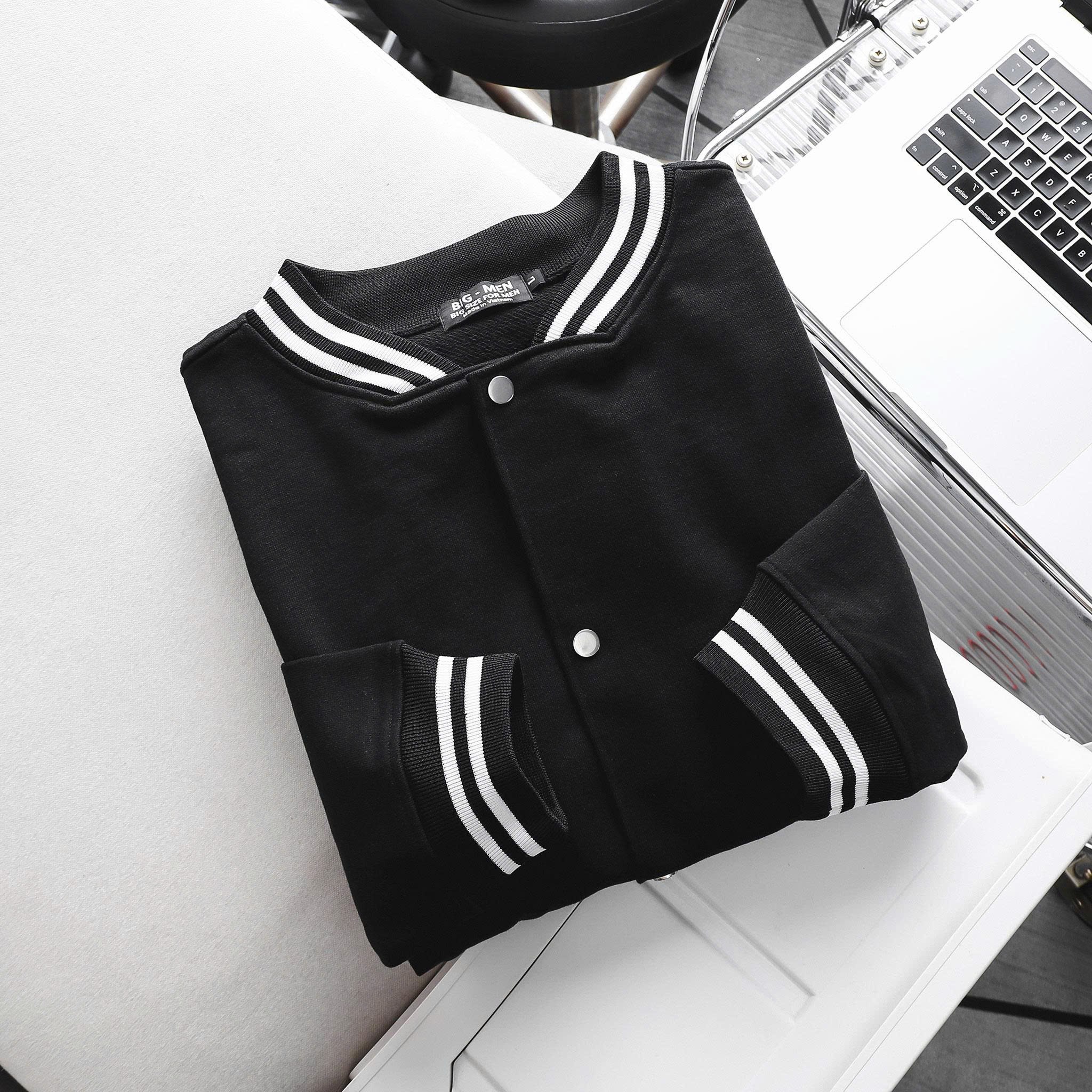 - Chi Tiết Đặc Trưng: Sử dụng cúc bấm kim loại chắc chắn. Viền cổ áo, cổ tay và gấu áo được bo bằng vải gân co giãn, có sọc trắng đen tạo điểm nhấn thể thao.