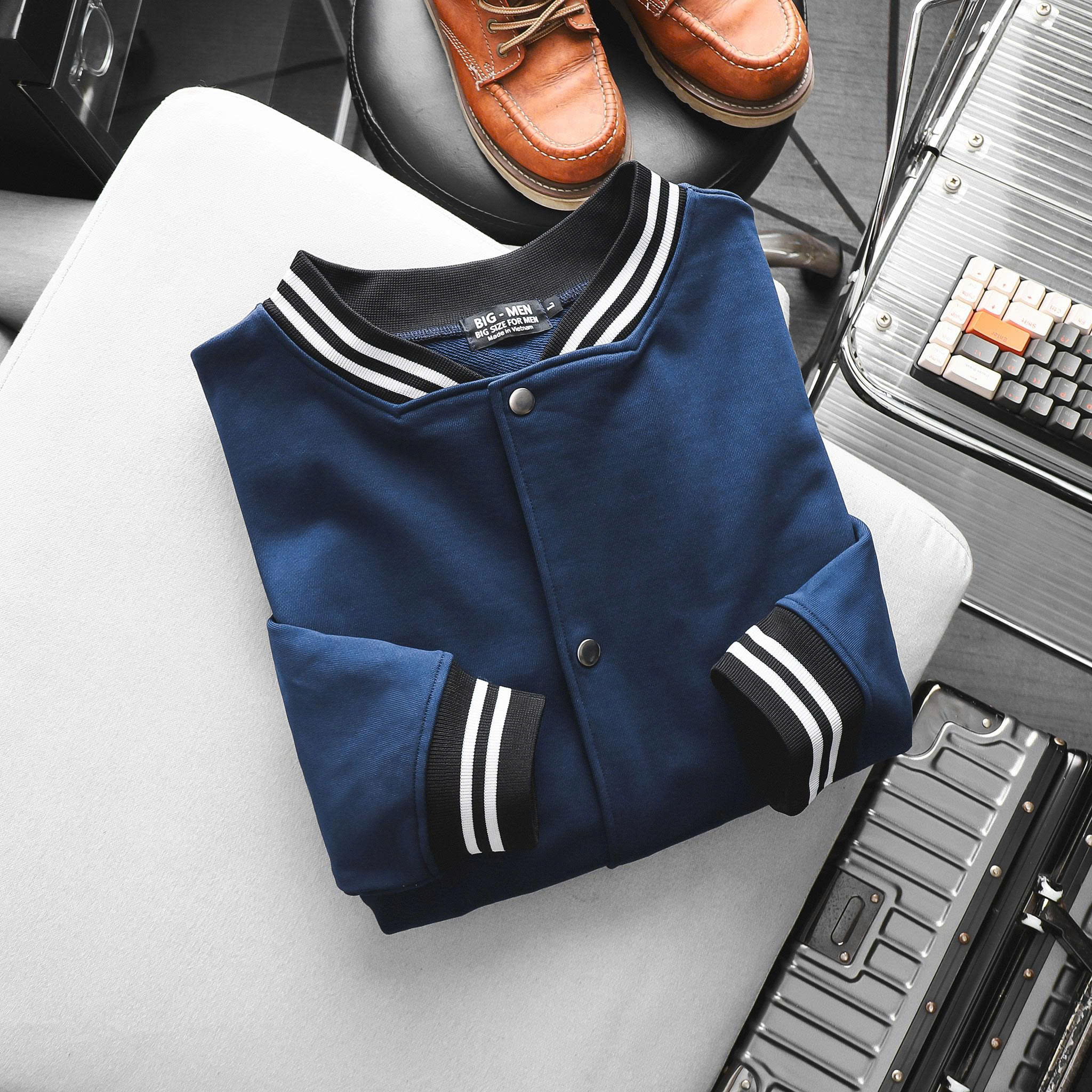 - Thiết Kế: Dáng Varsity/Bomber Jacket classic, form suông rộng rãi (Form Rộng/Oversize).